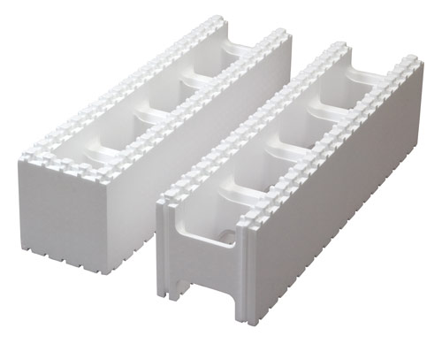 Округлення. Для отримання округлої форми стіни використовуються блоки стандартної форми і розмірів. Із внутрішньої сторони блоків необхідно виконати вертикальні вирізи шириною 0,2-1,5 см напроти кожного отвору. Потім блок згинається, і для того, щоб зафіксувати необхідну форму, внутрішня стінка блоку обмотується звичайним скотчем або склеювальною стрічкою. Після того, як із таких блоків буде збудована стіна і залита бетоном, скотч можна видалити (коли бетон набере початкову міцність).